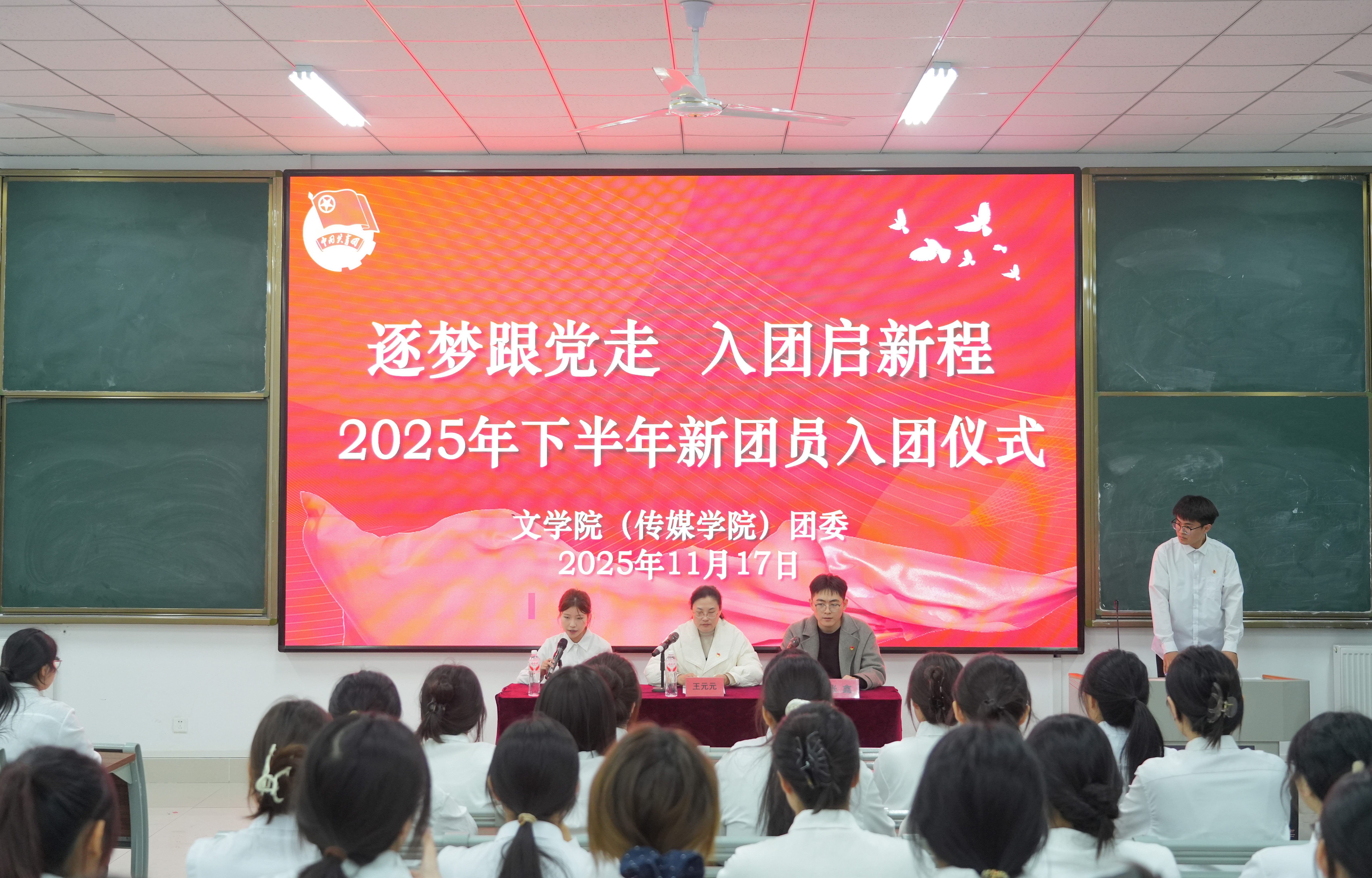 11月17日晚,文学院(传媒学院)在崇德楼208教室举行2025年下半年新团员入团仪式。仪式在庄严的国歌声中拉开帷幕,学院团委书记王元元、辅导员张鑫等出席活动。