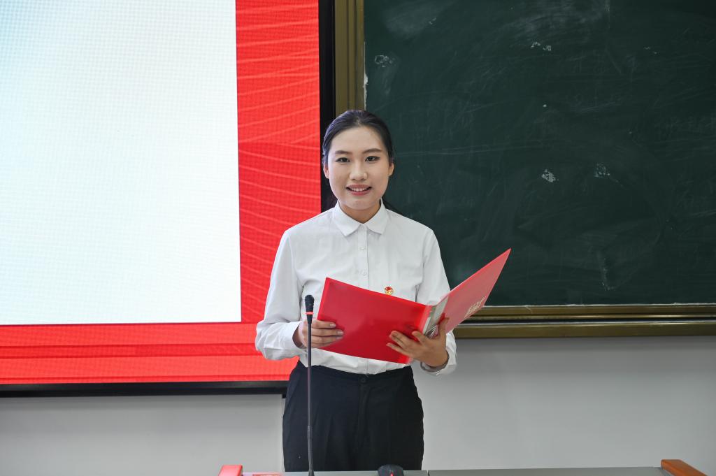 仪式上,张鑫宣读新发展团员名单并颁发团徽、团员证。全体新团员在封占烨带领下庄严宣誓,铿锵誓言彰显青春担当。优秀团员代表周艳萍和新团员代表韩涵发言,表示将用实际行动践行入团初心。