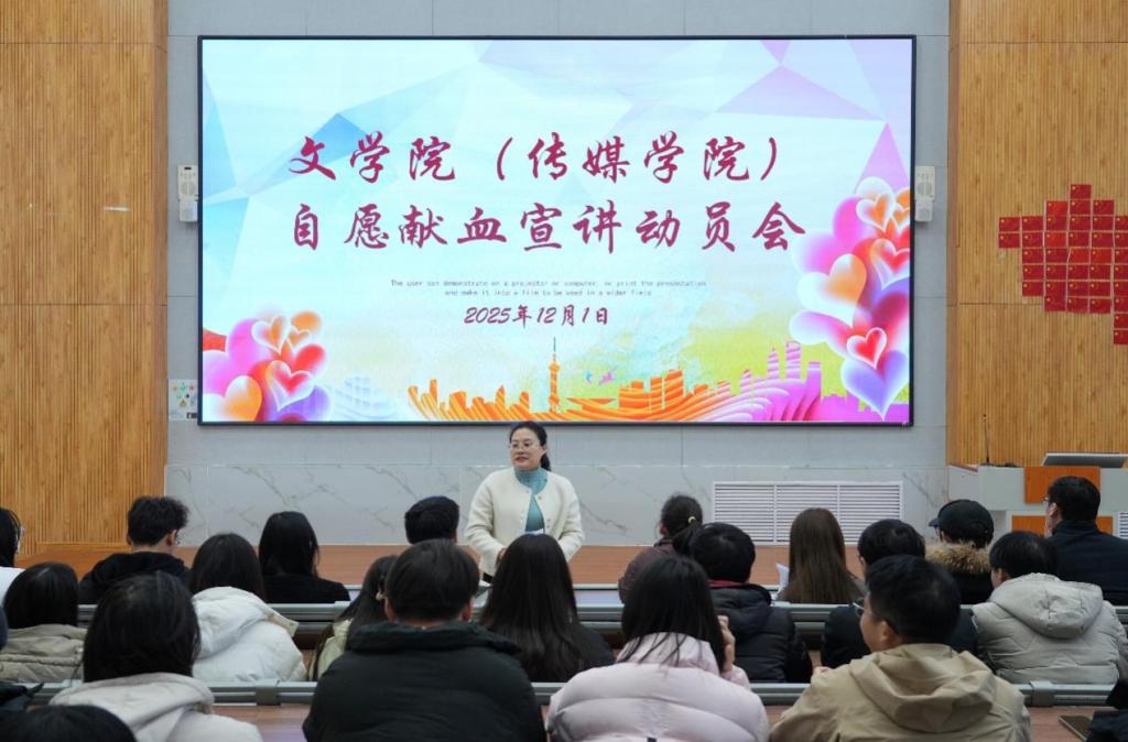为普及科学献血知识、消除认知误区,激发青年学子参与无偿献血的热情,12月1日,文学院(传媒学院)于增信楼113教室举办自愿献血宣讲动员会。学院团委书记王元元担任主讲人,为同学们带来了一场温暖而有意义的生命教育课。