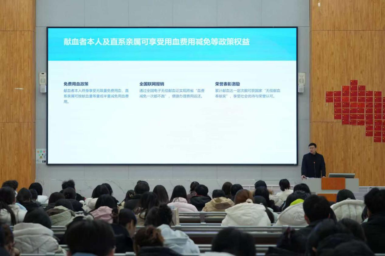 宣讲会上,魏述诚围绕无偿献血的核心意义、科学依据与社会价值进行了系统阐述。他详细介绍了献血条件、规范流程、注意事项及健康影响,并结合临床救治案例,重点强调了血液在临床救治中的关键作用和无偿献血的社会意义。