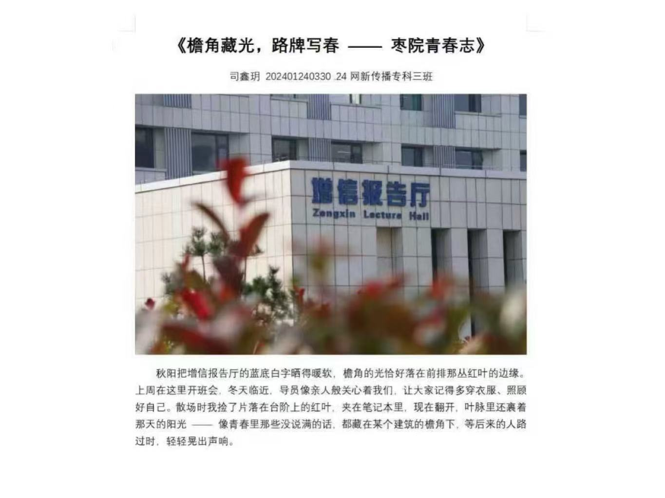 本次大赛以“山河之美”与“青春之力”的深度融合为核心创作主题,巧妙设计图文创作与海报表达两大专项。在图文创作专项中,参赛选手用镜头捕捉校园四时晨昏、师生间的动人温情瞬间;以细腻的笔触书写个人感悟与理想追求。生动展现了我院学子与时代同频共振、携手奋进的青春风采。