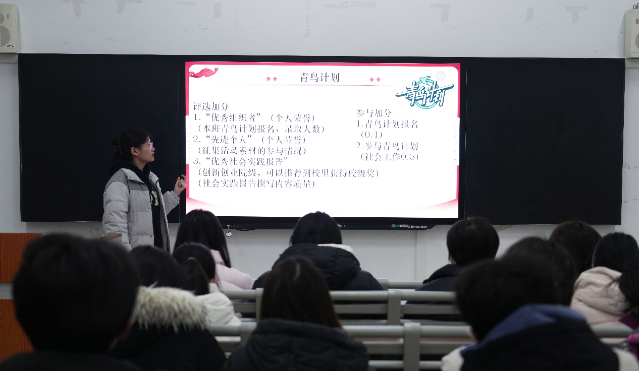 会议伊始,主讲人面向台下学生热情讲解,引导同学们聚焦“青鸟计划”的核心内容,随后对什么是“青鸟计划”、如何参加等进行详细介绍。主讲人还向学生们传递活动的意义、目标与后续安排等信息,帮助大家了解并加入到这项服务家乡、锻炼自我的实践项目当中,为后续实践环节的开展做好思想动员与信息铺垫。