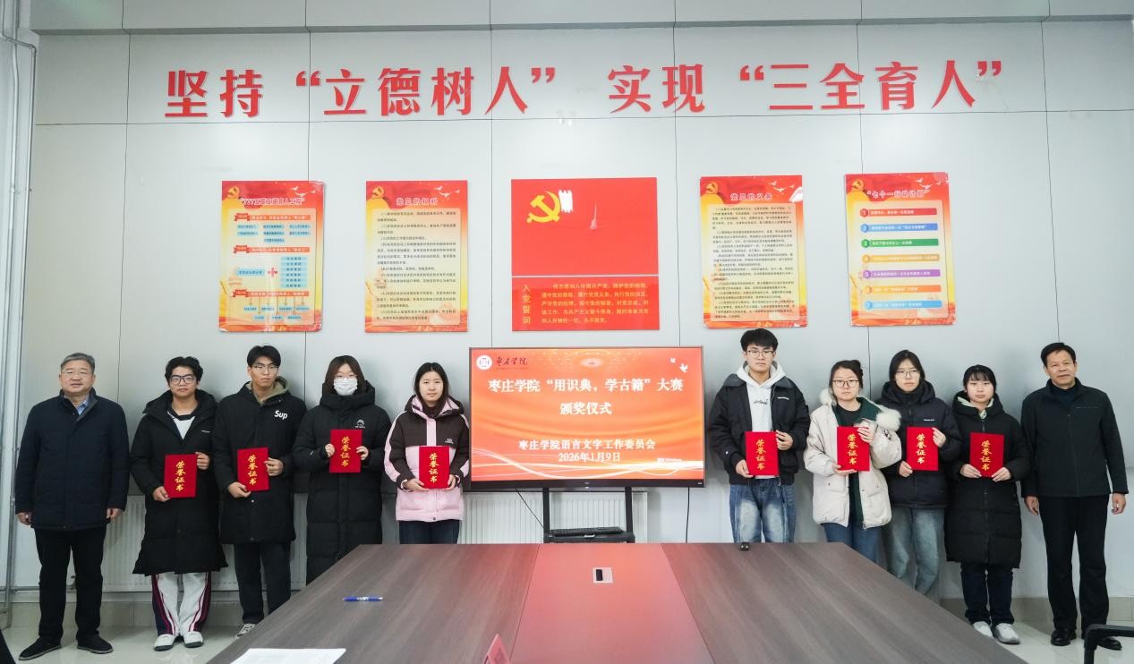 经专家组评审,大赛最终评出一等奖10名、二等奖20名、三等奖20名。2026年1月9日上午9时,大赛颁奖仪式在博雅楼B214会议室举行,枣庄学院文学院(传媒学院)党委书记宋明峰,枣庄学院语言文字工作委员会副主任、文学院(传媒学院)院长张爱民出席颁奖仪式并为获奖学子颁发荣誉证书与奖品。张爱民在讲话中对获奖学子表示祝贺,并指出,大赛是学校深化人才培养、推进语言文字工作高质量发展的重要抓手,对大学生夯实传统文化根基,提升人文素养;锻炼思辨创新能力,强化实践应用素养;增强文化自信与传承意识,培育时代担当;对推动汉语言文字的规范使用与深度理解、传承汉字文化精髓,活化语言文字遗产,都具有重要的意义。