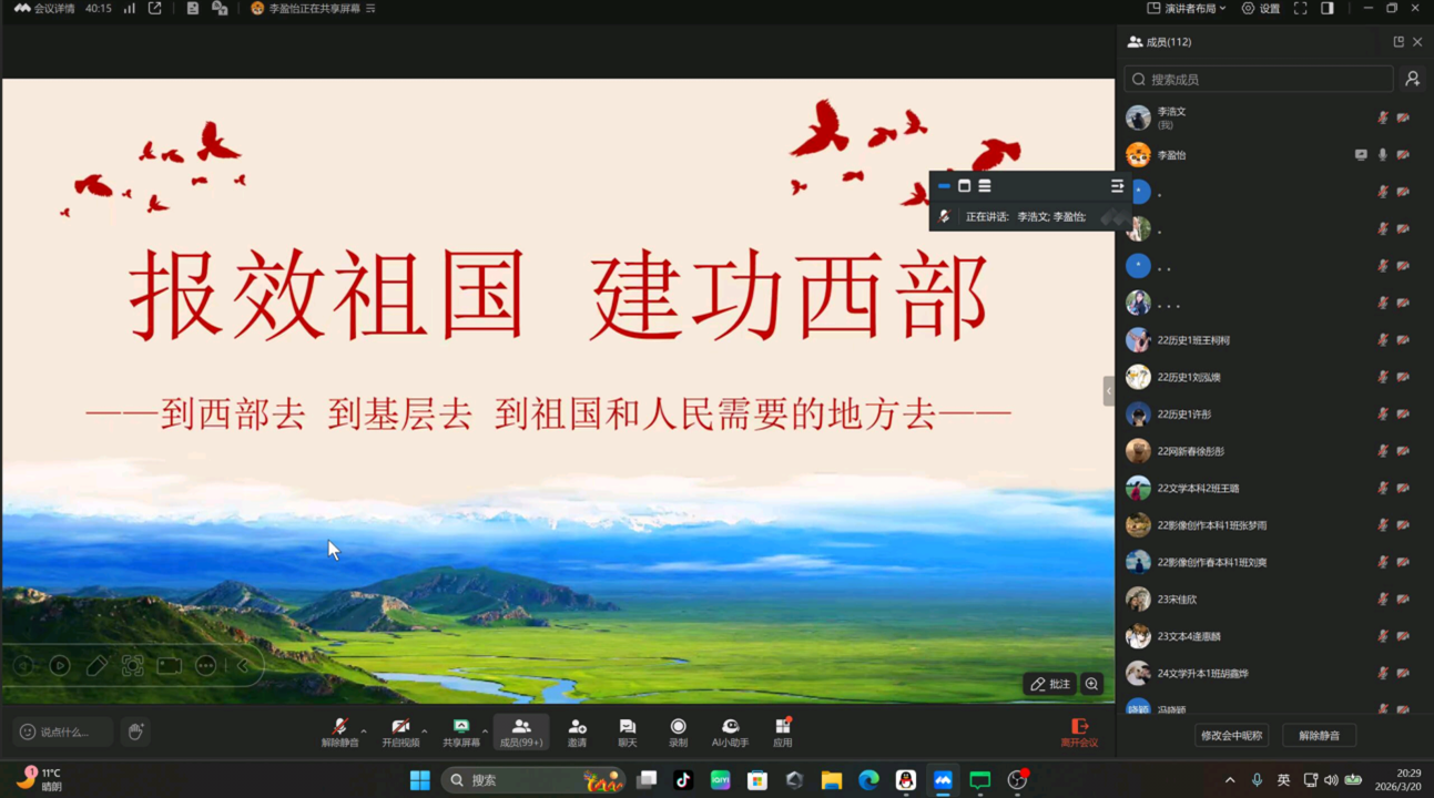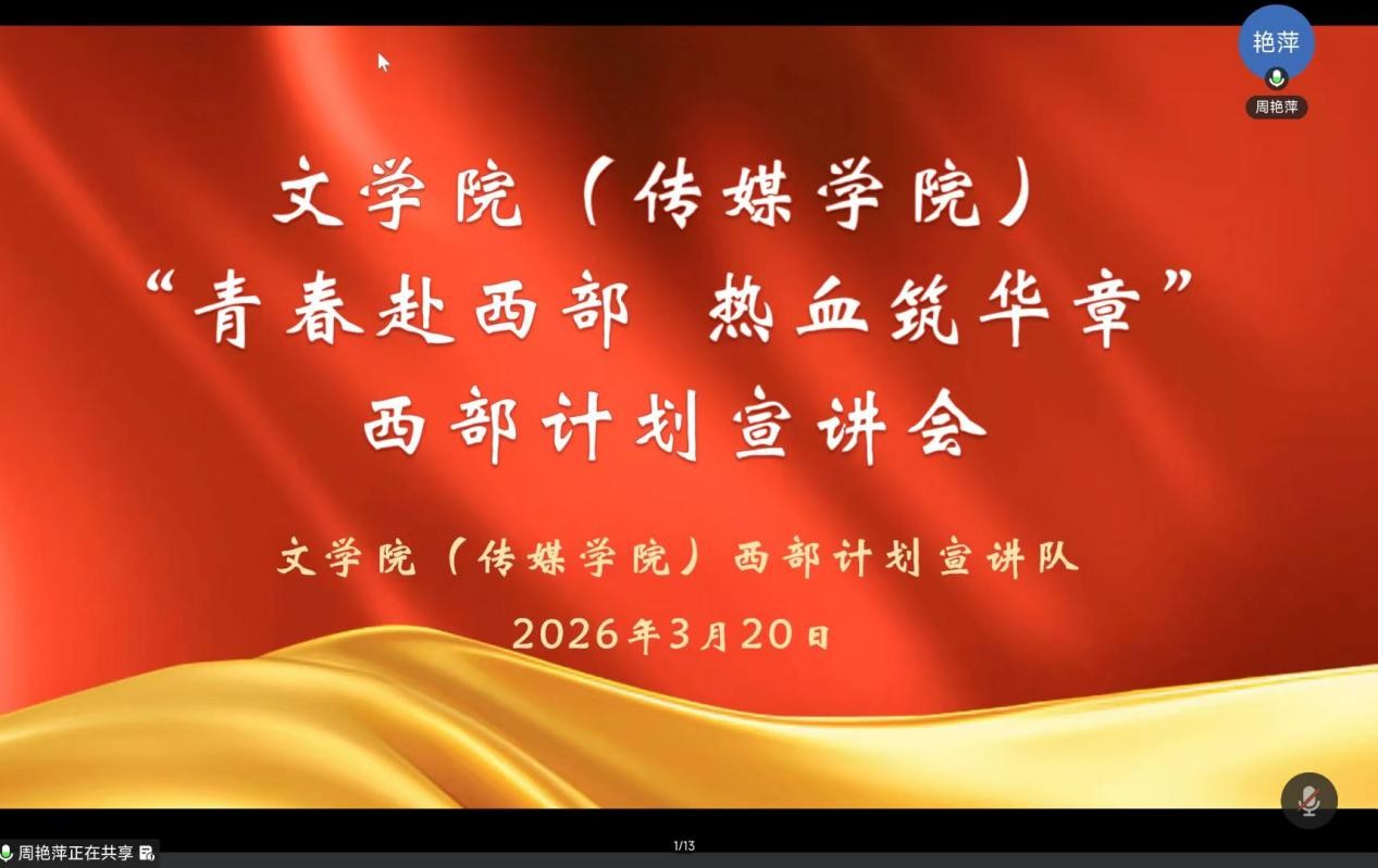 为积极响应国家西部建设号召,推动2026年西部计划招募工作有序开展,3月20日,文学院(传媒学院)举办“青春赴西部 热血筑华章”西部计划线上宣讲会,学院100余名师生参加。