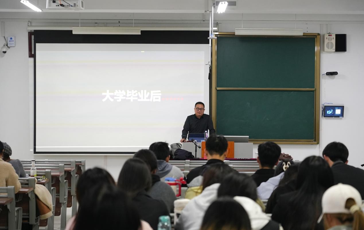 刘郑秋以大学生职业规划与就业指导为切入点,从选择行业、找岗定位、评定胜算三个维度,系统拆解职业规划逻辑,为在场学子构建清晰的发展路径。结合从业经验,他点明简历制作的典型误区,着重强调优先展示近期学业与实践经历,引导学生为顺利就业做好充分准备。随后,刘郑秋结合AI工具应用与行业数据,深入剖析市场现状,以AI改画、生成短剧等鲜活案例,直观呈现AIGC技术在多领域的广阔应用前景。基于这一行业发展趋势,他结合岗位招聘数据与往届毕业生就业情况,细致拆解企业用人标准,为在场学子传授实用应聘技巧。赵佳补充强调,实习需紧扣专业方向,推动实习与就业衔接贯通,为学生实习就业明确路径。