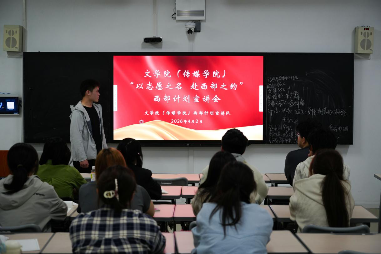 为积极响应国家号召,引导青年学子投身西部建设、服务基层发展,4月2日,文学院(传媒学院)组织开展“以志愿之名,赴西部之约”西部计划宣讲会。本次宣讲面向我院全体大一新生,由西部计划宣讲队深入大一14个班级,通过PPT展示与现场交流相结合的方式,开展了针对性的集中宣讲。